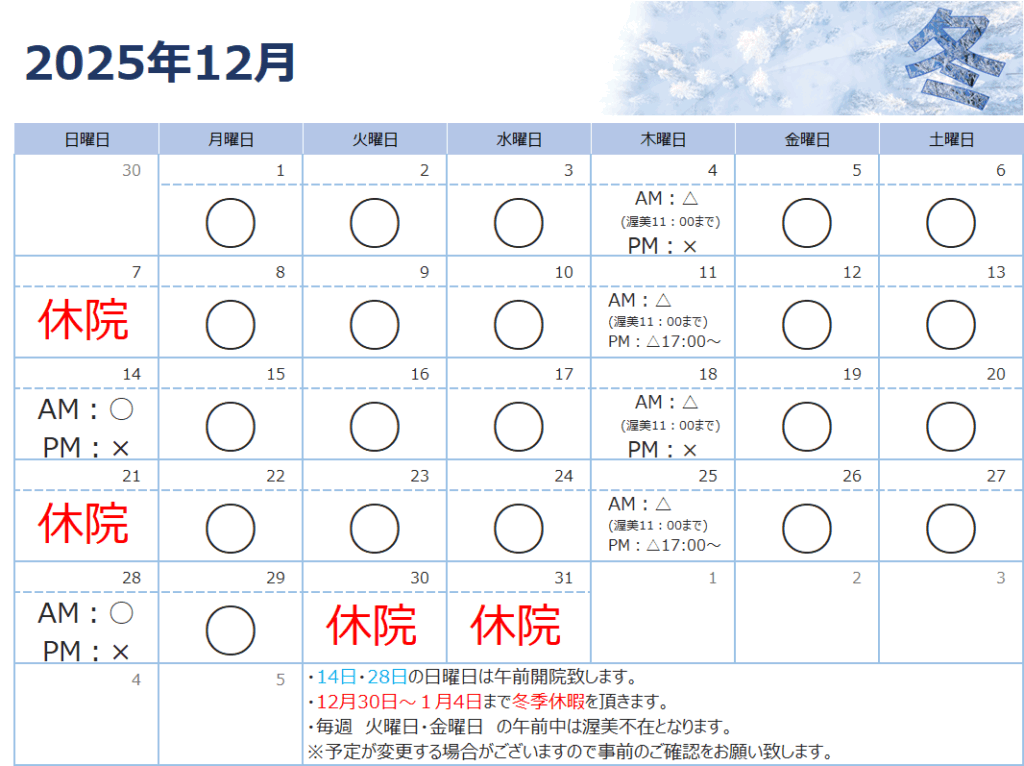 ○12月14日(日)、12月28日(日)の午前中は開院しておりますので、急な症状が有りましたらご連絡お待ちしております。