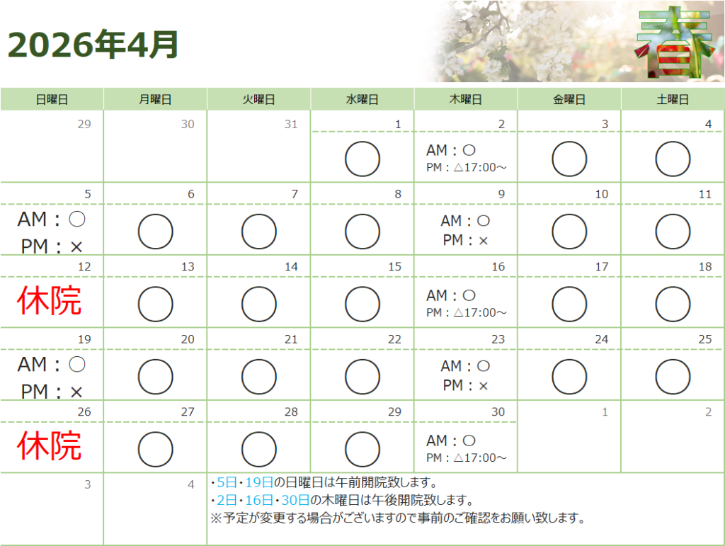 ○4月5日(日)、4月19日(日)の午前中は開院しておりますので、急な症状が有りましたらご連絡お待ちしております。